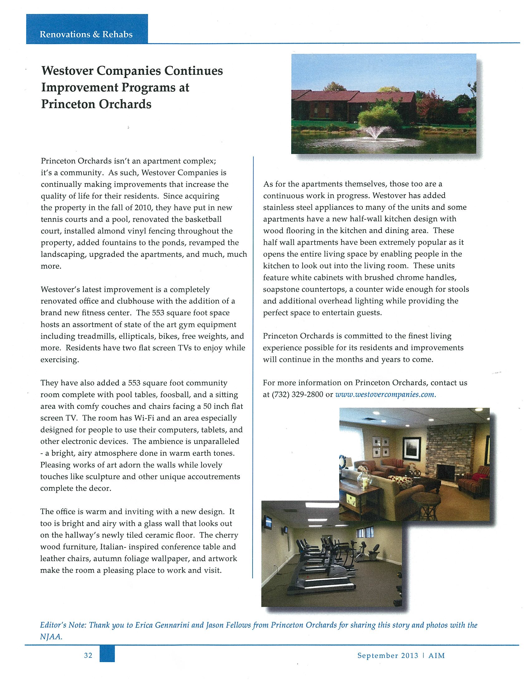Lotus Public Relation’s Erica Gennarini served as a contributing writer to AIM’s September 2013 issue. The article elaborated on Westover Company’s initiatives to improve the Princeton Orchards apartment complex.